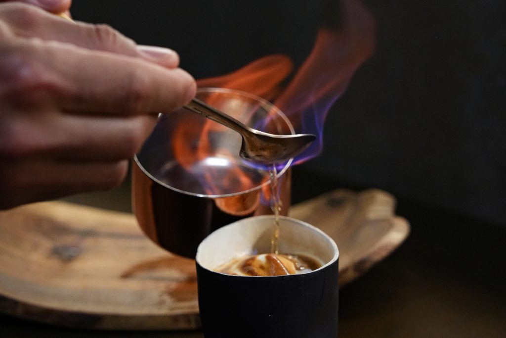 Among the most visual changes are the black oak tables, which are treated using an ancient Japanese technique known as Shou Sugi Ban, which is used to protect and strengthen the wood, making it more resistant and durable. The woods have been carefully torch-burned, a process that not only beautifies them, but also brings out their natural grain. When you run your hand over its surface, you can perceive a singular texture, which invites you to touch and feel it, evoking the same sensation that you experience when caressing a person’s skin. This detail, as well as being aesthetically attractive, adds a tactile dimension to the gastronomic experience at Casa Solla.