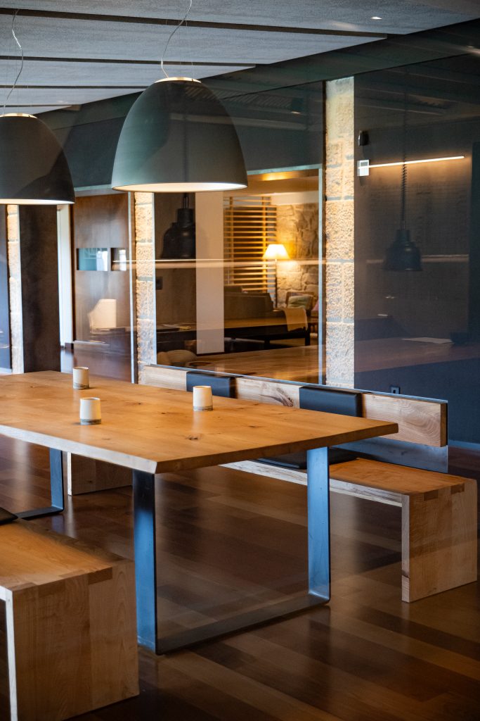 Some areas of the walls and the ceiling of the dining room have been covered with black cloth. This, in combination with the traditional Galician granite on the walls and the side tables, the black wood of the tables, and the iron, create a unique and enveloping atmosphere.