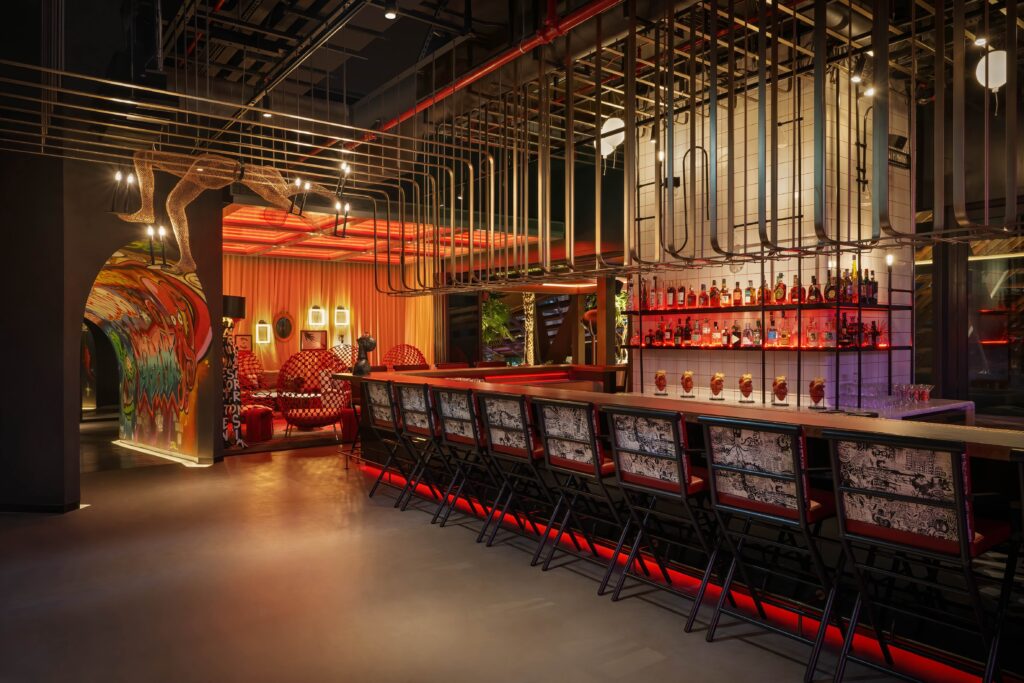 Guests arrive at the restaurant through a tunnel, setting the scene for the visually arresting experience that awaits them. Right at the end of the tunnel, a pendant light from Filipino designer Kenneth Cobonpue, representing an acrobat carrying ceiling lights, becomes the dramatic first view. The bar, covered in lava lamps and labyrinthine metal pipes holding glasses and bottles, along with other quirky touchpoints throughout, adds an element that’s fun and dramatic. An adjacent Lounge space showcases a collection of unique furniture pieces by Kenneth Cobonpue and Jimmy Martin, paired with a fabric wall of onyx frame and fun art pieces, creeping through the courtains creating a quirky yet cohesive design.