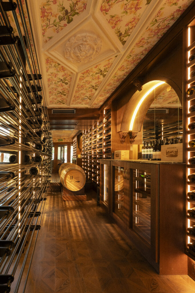 Uno de los espacios más singulares del restaurante será la vinoteca, que se extiende desde el lobby hasta el comedor, permitiendo a los clientes elegir su vino como parte de la experiencia.